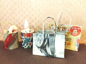 はり合わせた新聞紙でバッグとロールペーパーホルダーを作ります。