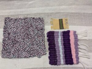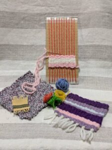 段ボールやお菓子の空き箱など家の中にある身近な材料で作った織り機で織物体験ができます。編み物をした時に残る少しの毛糸。着られなくなったシャツや布。